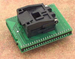 universal adapter, assigned for NOR-Flash devices in PLCC32 package. This adapter is designed for mass-production. Operation (mechanical) life of ZIF socket - 10.000 actuations